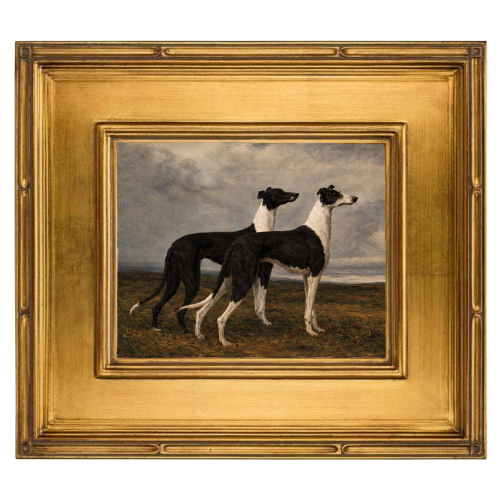 This classic artwork features two elegant hounds posed in quiet symmetry against a soft, atmospheric landscape. Their refined forms and alert stance convey grace, balance, and timeless sophistication.